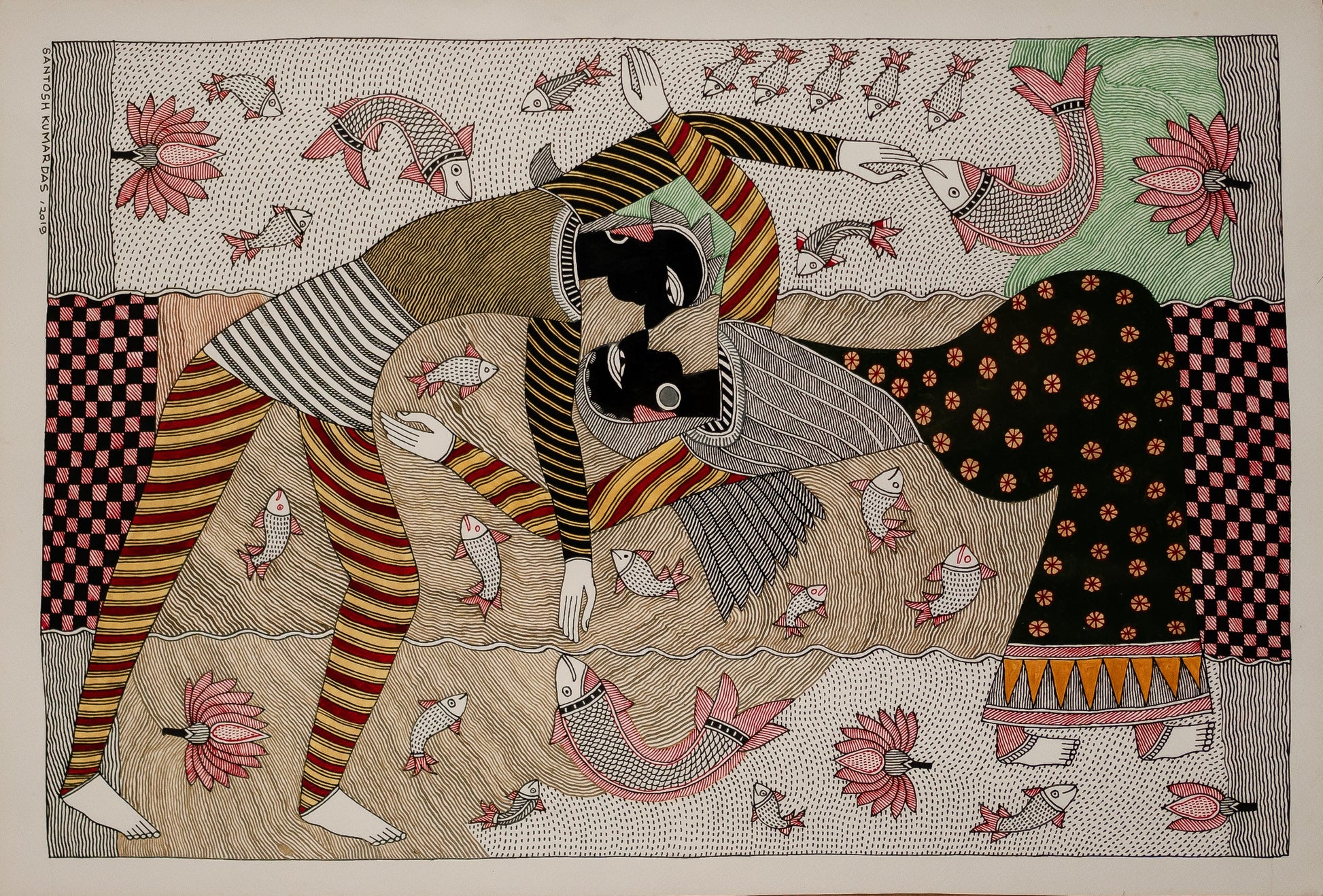 A contemporary take on traditional Madhubani art, Flying Lover draws inspiration from parrots—cherished symbols of love and playful connection. Surrounded by lotus flowers and fish in a serene pond, the couple is blessed by nature’s most sacred symbols: the lotus for purity and divine love, and fish for fertility and good fortune. With a modern color palette and imaginative composition, the artist breathes fresh life into timeless tradition.