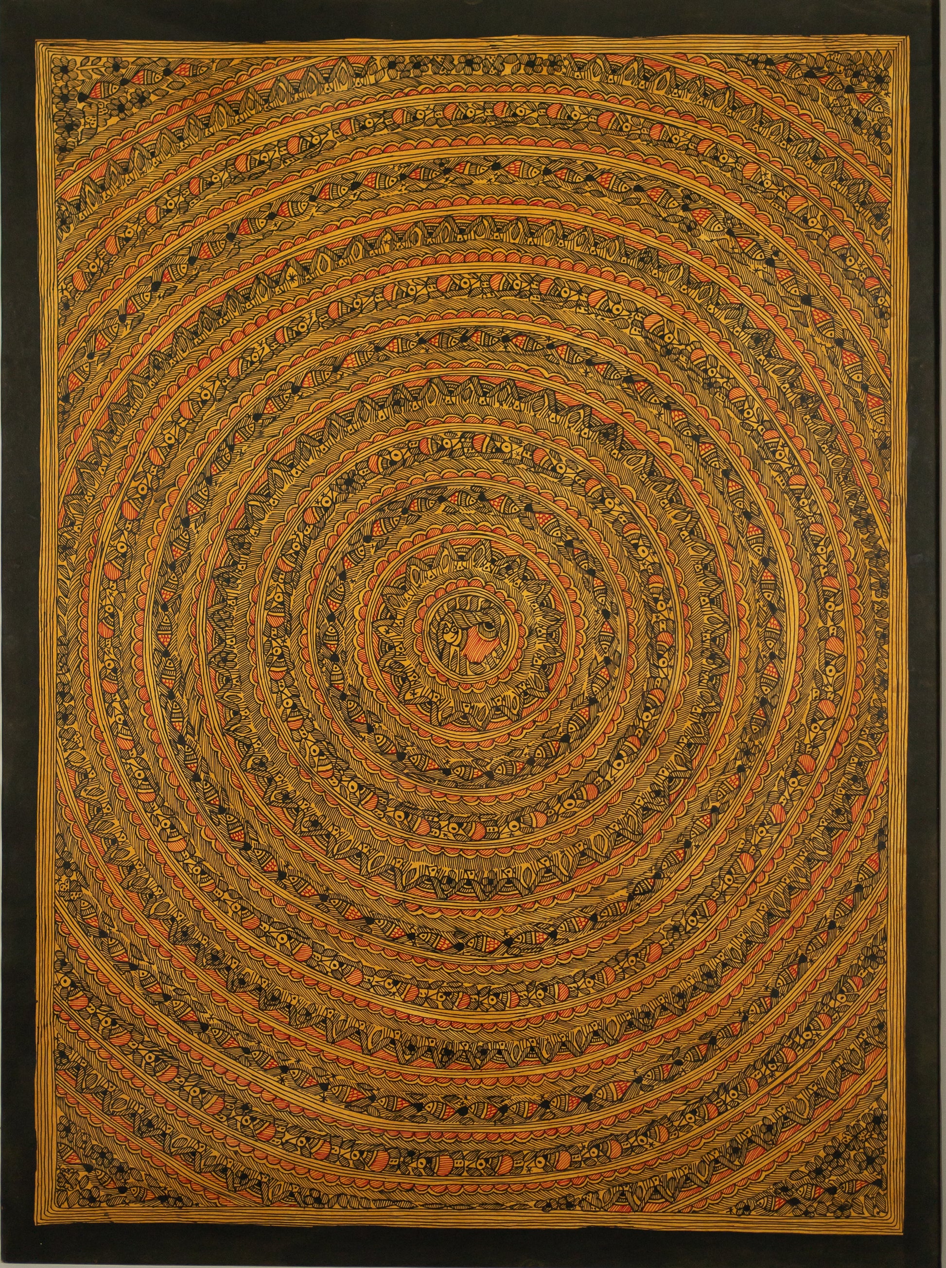 Born from tribal tattoo traditions, this vibrant Godhna piece transforms symbolic body art into a visual story. Peacocks, fish, and circular patterns celebrate nature, prosperity, and the flow of life in a modern reinterpretation of an ancient style.