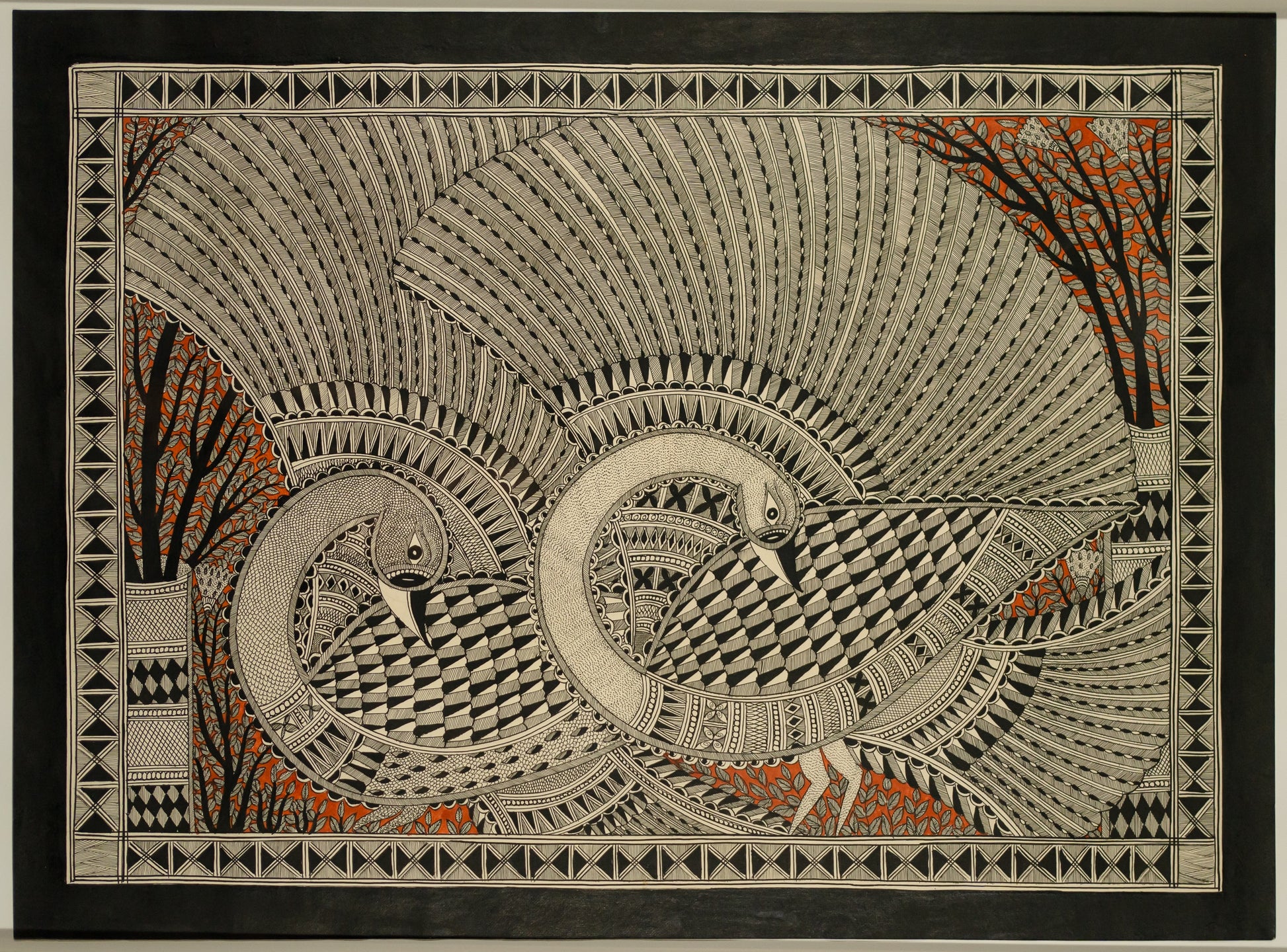 In Madhubani art, the peacock is more than a graceful bird - it symbolizes divine love, wisdom, prosperity, and protection. Its feather, shaped like an eye, is believed to ward off negativity and the evil eye. Inspired by the traditional Kachni style, known for its fine linework and monochromatic black ink, the artist has added a modern twist with subtle, minimal color - enhancing the visual storytelling without losing authenticity.