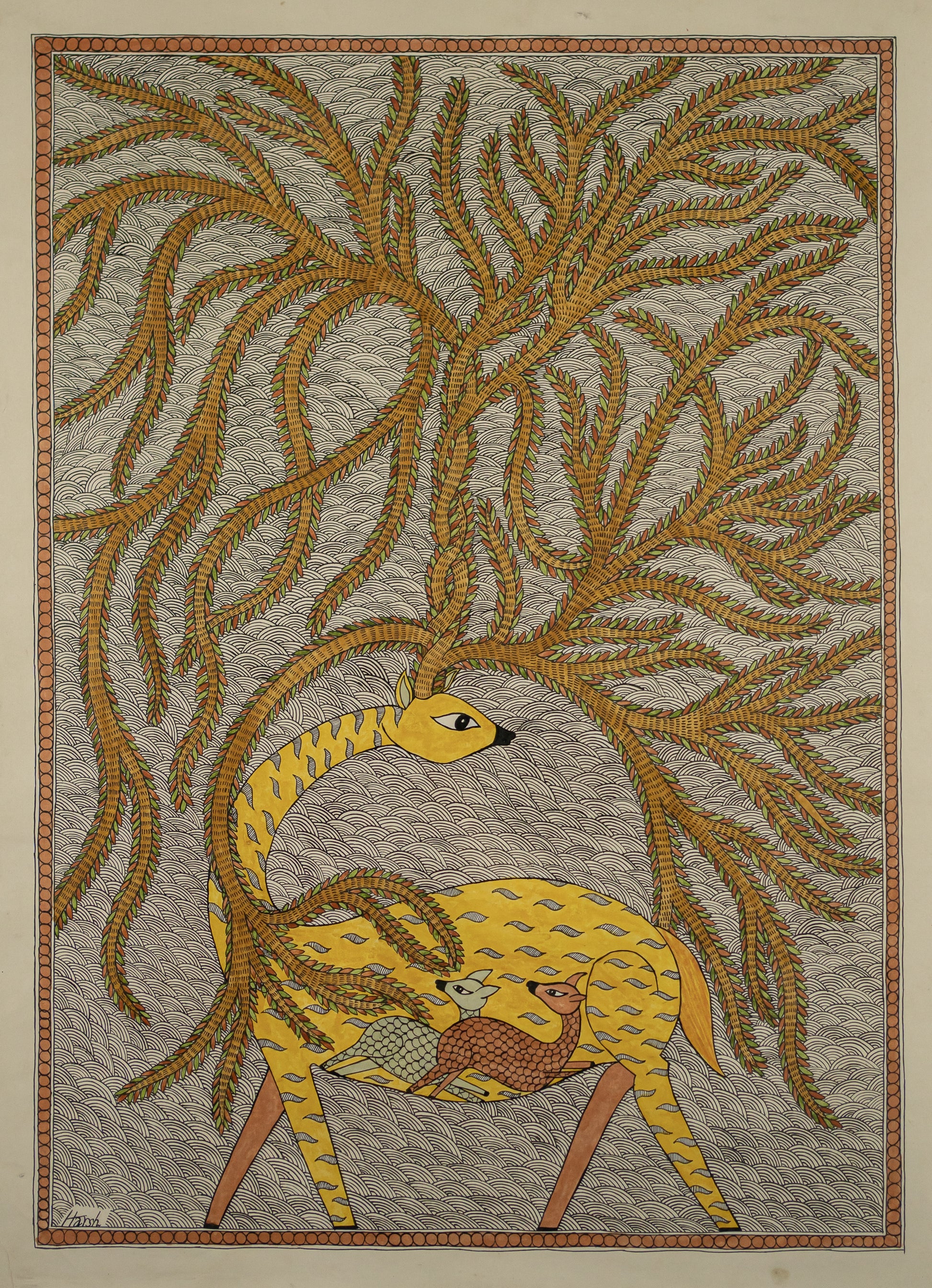 A pregnant deer stands as a symbol of survival and nurturing, with a tree sprouting from her horns to represent life’s eternal cycle. Rendered in earthy greens and yellows, this Madhubani painting honors nature’s delicate balance with exquisite detail.