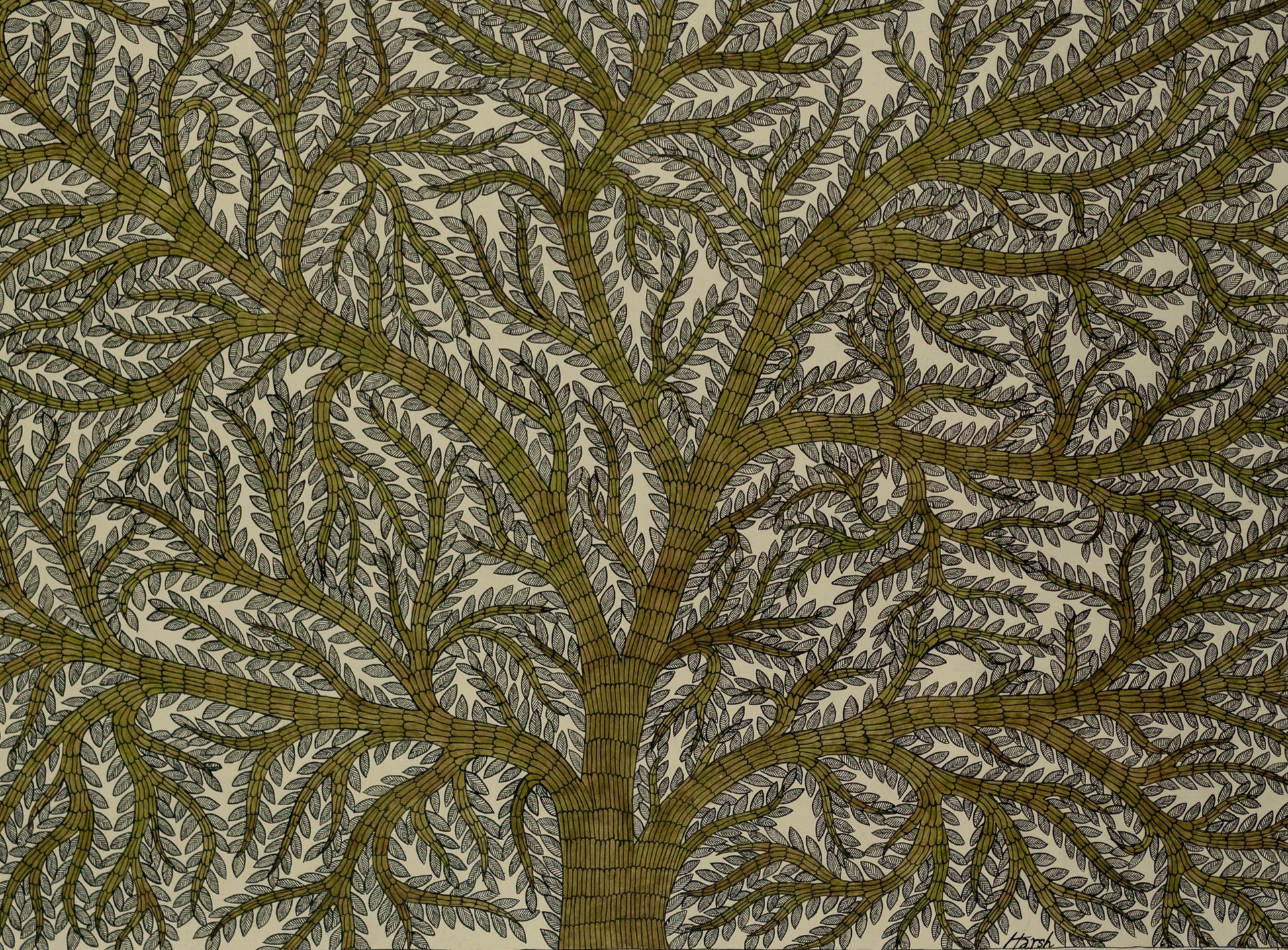 The Tree of Life is a timeless symbol in Indian art, representing the deep interconnectedness of all living beings. With roots reaching into the earth and branches stretching toward the sky, it connects all realms of existence - embodying strength, wisdom, and harmony in nature. This intricately detailed piece, painted in naturally dyed green watercolor, reflects our own journey of growth, resilience, and the pursuit of knowledge.